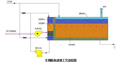 惡臭氣體經(jīng)過管道收集后進入預(yù)處理裝置,經(jīng)水洗加濕使廢氣的濕度增加,濕氣體再進入生物過濾除臭裝置,氣流與循環(huán)液在穿過生物填料層的過程中完成生物的氣液擴散、液固擴散、生物氧化三個過程,生物填料表面生物膜中的微生物以惡臭氣體物質(zhì)為營養(yǎng),惡臭物及VOCs被微生物氧化分解,在轉(zhuǎn)化過程中產(chǎn)生能量,為微生物的生長與繁殖提供能源,使惡臭氣體物質(zhì)的轉(zhuǎn)化持續(xù)進行,經(jīng)凈化后的氣體由引風機引出排放。