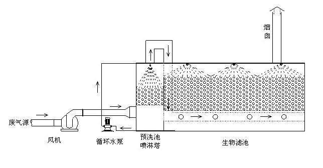 惡臭氣體收集裝置→預(yù)處理裝置→生物過濾裝置→抽風機→達標排放