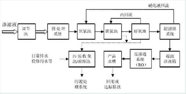 通過以上對垃圾滲濾液的各污染物分析及其水質(zhì)水量受當(dāng)?shù)貧夂蚝屠盥駡觥澳挲g”的影響,對處理方法一一進(jìn)行說明和比較,結(jié)合生活垃圾滲濾液的具體情況以及污水處理的目的、投資、占地面積、能耗、運(yùn)行費(fèi)用、管理方面程度、運(yùn)行可靠性及使用壽命等綜合因素的分析,以及我公司根據(jù)大量前期調(diào)研結(jié)果、吸收國內(nèi)外滲濾液處理的經(jīng)驗(yàn)并結(jié)合多年廢水治理的實(shí)踐經(jīng)驗(yàn),在進(jìn)行充分、合理分析污水處理系統(tǒng)運(yùn)行過程中將會出現(xiàn)的水質(zhì)沖擊負(fù)荷及當(dāng)?shù)氐木唧w氣候等情況后,特采用以下工藝: