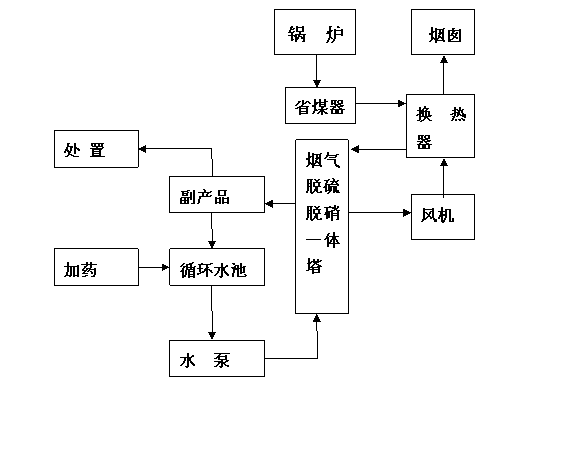 本方案設(shè)計流程:煙氣→余熱回收裝置(省煤器)→換熱器→除塵器→脫硝脫硫一體塔→換熱器→排放。(本流程僅供參考,我公司根據(jù)不同情況設(shè)計不同方案,但均以處理達標、投資小、占地面積小、管理方便為宗旨)