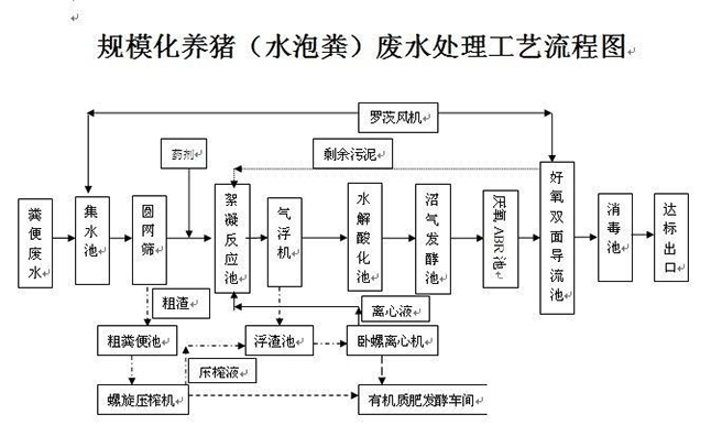 根據(jù)畜牧養(yǎng)殖場污水水質(zhì)特性及排水狀況(水沖糞工藝),在污水處理工藝前端要設(shè)置初沉池,以利糞便與污水初步分離,減少污水處理量。分離后的糞便和人工清除的糞便作堆積發(fā)酵處理后,加工成為有機(jī)肥出售或另作他用。