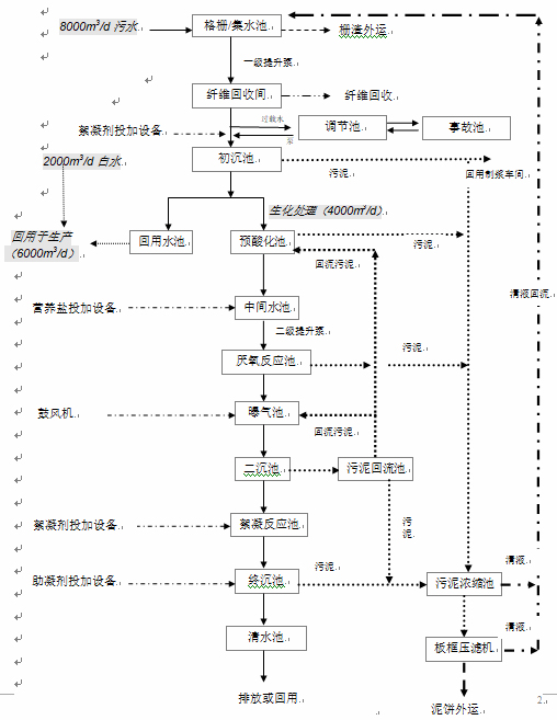 各車間、工段生產(chǎn)廢水經(jīng)初次撈漿后,輸送至格柵渠,在此撈除大塊的浮渣后進(jìn)入集水池。廢水經(jīng)集水池內(nèi)的提升泵提升到纖維回收間進(jìn)一步去除懸浮物、實(shí)現(xiàn)漿回收,同時(shí)為后續(xù)的生化處理系統(tǒng)創(chuàng)造條件。廢水經(jīng)過纖維回收設(shè)備后自流到初沉池,去除水中的絕大部分懸浮物,以確保回用水的回用水質(zhì),在初沉池后廢水回用至生產(chǎn)車間,同時(shí)白水也直接回用;其余的的廢水進(jìn)入下一個(gè)污水處理工段;